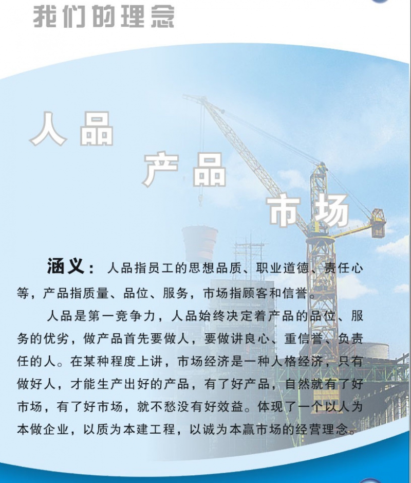 人品是第一競爭力,人品始終決定著產(chǎn)品的品位,服務(wù)的優(yōu)劣,做產(chǎn)品首先要做人,要做講良心、重信譽、負責(zé)任的人,在某種程度上講,市場經(jīng)濟是一種人格經(jīng)濟,只有做好人,才能生產(chǎn)出好的產(chǎn)品,有了好產(chǎn)品,自然就有了好市場,有了好市場,就不愁沒有好效益。體現(xiàn)了一個以人為本做企業(yè),以質(zhì)為本建工程,以誠為本贏市場的經(jīng)營理念。